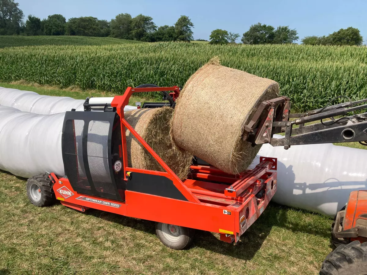 Thirty-five years of KUHN wrapping heritage have proven these pre-stretchers in various conditions around the world. The standard pre-stretchers, which each hold a 30” (750 mm) roll, are made of aluminum to avoid build-up of tack from the film. Both outer ends of the aluminum rollers are cone-shaped to maintain the optimum width of the film and reduce the risk of film tear on the edges. The special ribbed profile of the aluminum rollers keeps air and water away from the film. The location of the pre-stretchers makes it very easy to change the film rolls. The standard pre-stretch of 70% is reached by a low-maintenance and low-noise gear transmission.