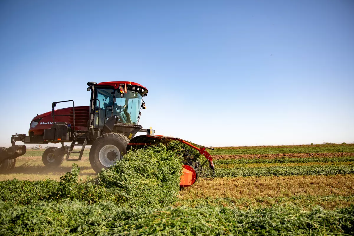 KUHN self-propelled mounted Merge Maxx® merger heads are the right size to enhance the productivity and efficiency of many chopping and baling operations. Designed for commercial operations with flat terrain common in the west, these mergers improve comfort by bringing the work in front of the operator. They are unique in the industry and unmatched in simplicity of operation, durability and merging capabilities. The floating windguard ensures the operator lays down smooth and even windrows while the crop netting improves leaf retention into the windrow. The heads are compatible with select self-propelled MacDon windrower models.