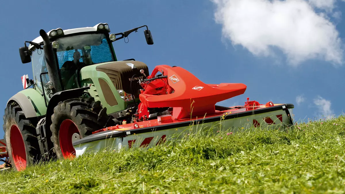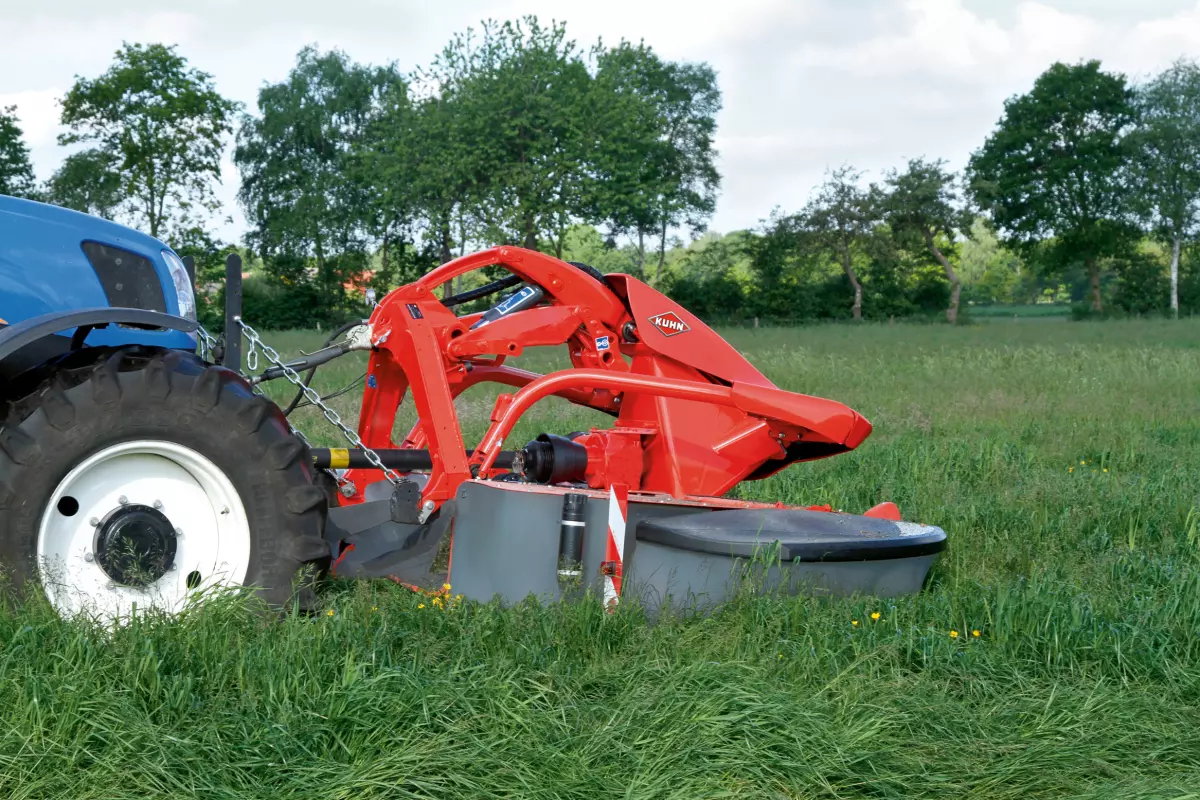 Front mowing units have to remain flexible enough to smoothly adapt to any terrain changes they may encounter. At the same time, they are often subject to higher stress. The KUHN front mount mowers are designed for this purpose, they feature a pendulum-type articulation of the mowing unit and significant adaptability characteristics. They can oscillate left to right at an angle of up to 30° and cover a vertical travel range of 27.5”.