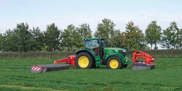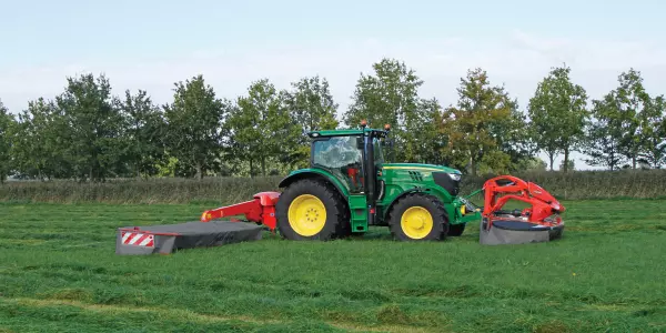 KUHN GMD 25 F Series front mounted mowers, with working widths ranging from 10’2” to 11’6 can be used on their own, or as part of a triple-mower combination allowing you to cut up to 32’6” in one pass.