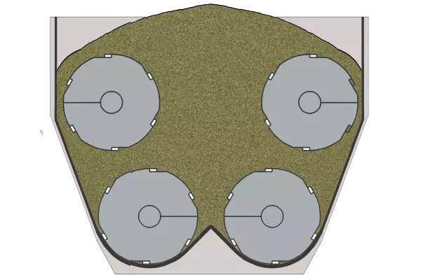 The raised lower right auger configuration, along with the close tolerance between the auger flighting and the auger troughs, results in a fast and complete cleanout. The offset upper right auger in combination with the raised lower auger requires less horsepower and provides a faster mix time.