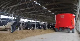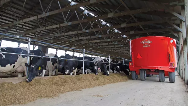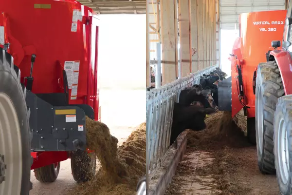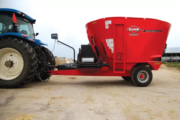 KUHN Knight VSL 200 Series Vertical Maxx® single-auger mixers are designed for small- to mid-sized dairy and beef producers. Two models, ranging from 420 to 550 cubic foot capacities (with extensions), offer the versatility of front, side or rear door unloading. The low-profile design is perfect for quick and easy loading. The proven cone-auger design reduces horsepower requirements, results in more efficient movement of feed and enhances final cleanoff of the auger when unloading.