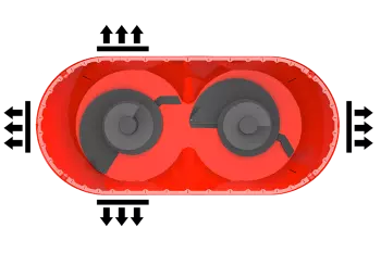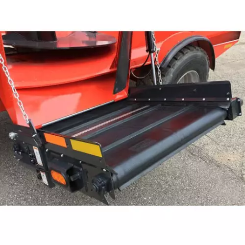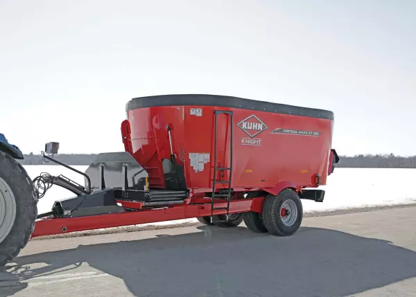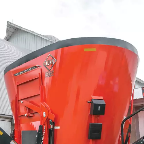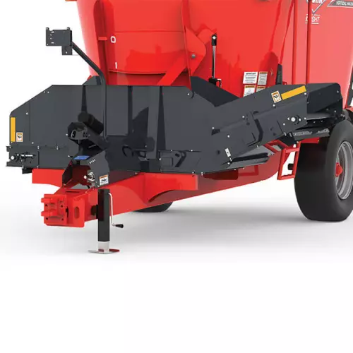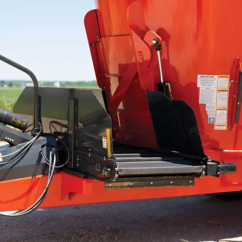 New cone-style augers provide superior feed movement for faster, more complete mixing and processing. The smooth, continuous auger flighting (1) creates a rolling feed action that improves mixing. The top cover of the auger has a steep angle to aid in bale movement when processing round bales and to prevent feed from sitting on top of the auger between mixes. The swept back bolt-on kicker (2) provides a fast and even discharge. Each lead flight is equipped with a cast iron scraper (3) that pulls material away from the tub walls into the auger for a better overall mix. Both the kicker and scraper are bolt-on attachments, making replacement very easy to save you precious time.