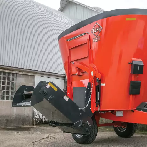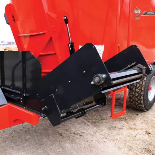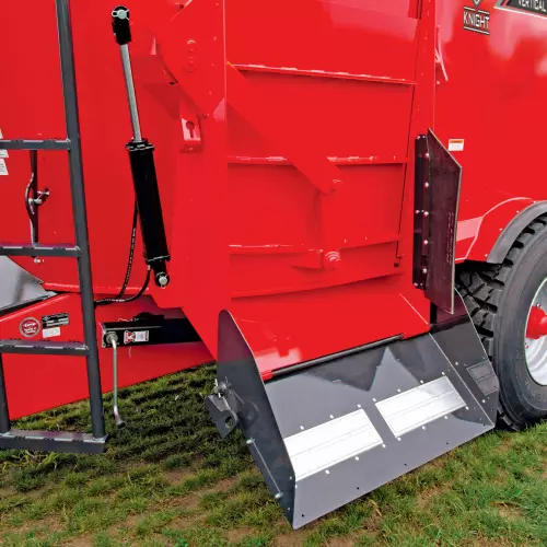 Cone-style augers provide superior feed movement for faster, more complete mixing and processing. The smooth, continuous auger flighting (1) creates a rolling feed action that improves mixing. The top cover of the auger has a steep angle to aid in bale movement when processing round bales and to prevent feed from sitting on top of the auger between mixes. The swept back, bolt-on kicker (2) provides a fast and even discharge. The new kicker mount design is stronger and built to withstand the harshest resistance. Each lead flight is equipped with a cast iron scraper (3) that pulls material away from the tub walls into the auger for a better overall mix. Both the kicker and scraper are bolt-on attachments, making replacement very easy to save you precious time.
